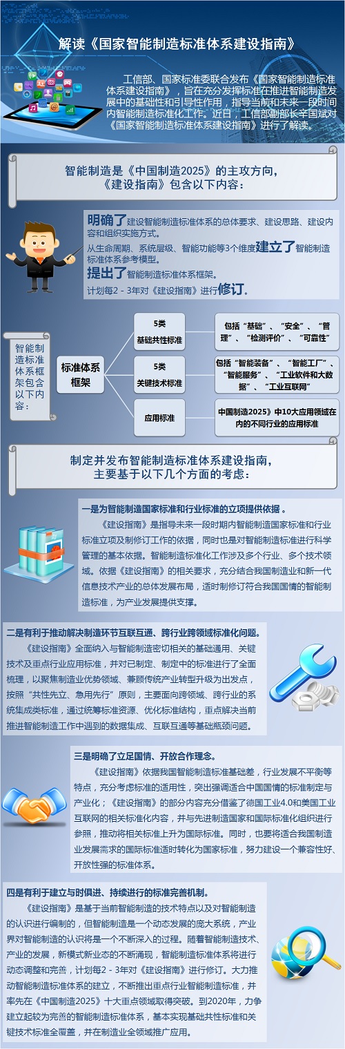 加快推进智能制造,是实施《中国制造2025》的主攻方向,是落实工业化和信息化深度融合、打造制造强国的战略举措,更是我国制造业紧跟世界发展趋势、实现转型升级的关键所在?!爸悄苤圃臁⒈曜枷刃小?。根据《中国制造2025》的战略部署,《建设指南》明确了建设智能制造标准体系的总体要求、建设思路、建设内容和组织实施方式,从生命周期、系统层级、智能功能等3个维度建立了智能制造标准体系参考模型,并由此提出智能制造标准体系框架,框架包括“基础”、“安全”、“管理”、“检测评价”、“可靠性”等5类基础共性标准和“智能装备”、“智能工厂”、“智能服务”、“工业软件和大数据”、“工业互联网”等5类关键技术标准以及在不同行业的应用标准。为便于企业参阅,“建设指南”对现有智能制造相关标准按“基础共性”、“关键技术”和“重点行业”进行了分类整理。?