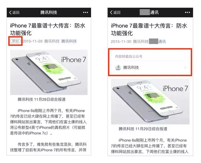 ▲图7 原创声明功能发布的文章效果图(左:原创文章;右:转载文章)
