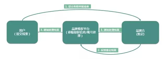微信品牌维权平台是将用户举报的售假信息与具有鉴假能力的商标权人有效对接的假货打击媒介,微信日常通过后台系统对用户提交的假货举报信息进行分类汇总,成功接入该平台的品牌方(即商标权利人)可以获得微信推送的与该品牌相关的假货举报信息,品牌方通过其专业的鉴别能力鉴别核实有关举报是否属实并通过品牌维权平台反馈给微信,微信根据品牌方反馈对售假帐号执行处罚,并将结果通知用户和品牌方(如图9)。
