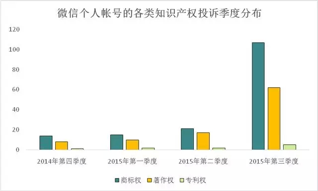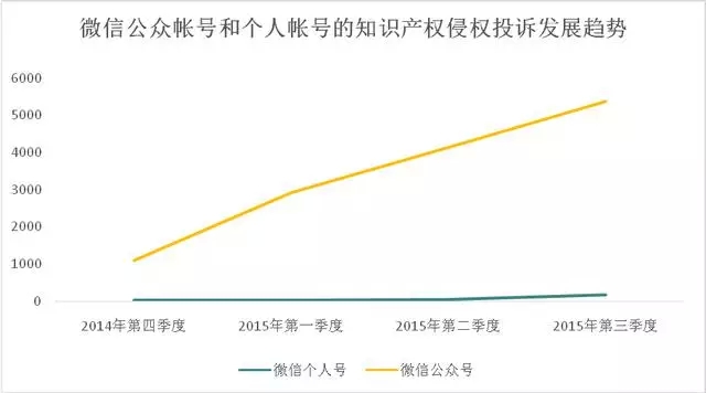 2014年第四季度至2015年第三季度,微信收到针对微信公众帐号的投诉超过2.2万件,其中涉及知识产权的投诉超过1.3万件,知识产权投诉占比达到60%;针对微信个人帐号的投诉超过1.2万件,其中涉及知识产权的投诉有200多件,比例仅为2%。
