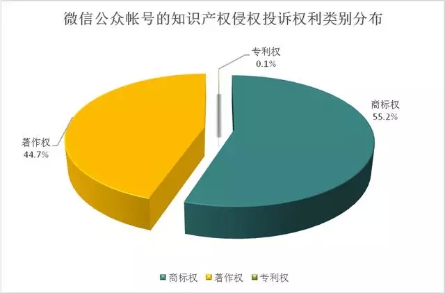 两类知识产权侵权投诉系统的数据在商标权侵权类型上达成一致,说明在商标权领域涉嫌未经授权使用他人商标的行为非常常见,这与社会现实情况相应和。公众帐号和微信个人帐号的侵权行为是现实社会侵权行为在网络中的投射。