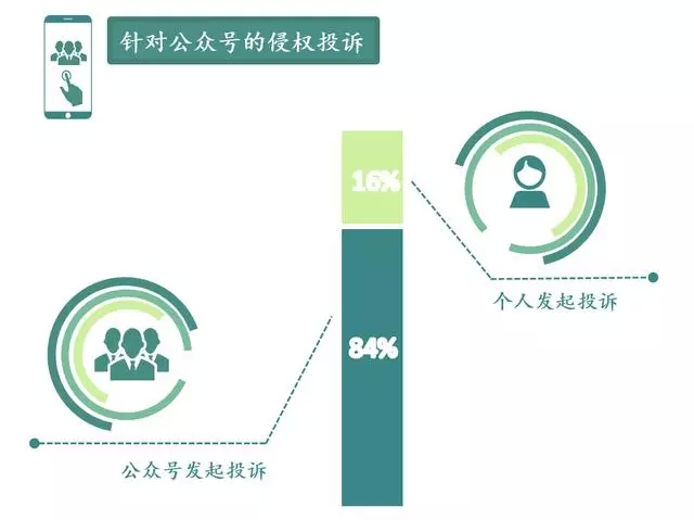 在微信公众平台投诉系统中,由公众帐号用户发起的知识产权侵权投诉占比84%,而个人用户通过微信手机客户端扫码发起投诉的占比为16%。