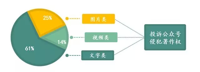 就涉嫌侵害著作权的行为分布而言,公众帐号涉嫌侵权行为集中在对文字类作品的抄袭上,占比61%,而图片类(占比25%)和视频类(占比14%)相对较少。
