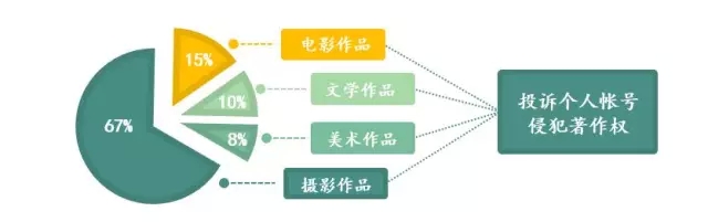 在个人帐号侵权投诉中,著作权侵权的类型呈现了不同的特点。涉嫌侵害摄影作品著作权的投诉占2/3(67%)左右,其余1/3由侵害他人电影作品著作权(15%)、文字作品著作权(10%)和美术作品著作权(8%)构成。