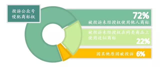 就涉嫌侵害商标权的行为分布而言,投诉公众帐号侵害商标权的,有72%的理由为被投诉人涉嫌未经授权使用他人商标,22%的理由是涉嫌在同类或近似商品上使用与投诉人近似的商标。