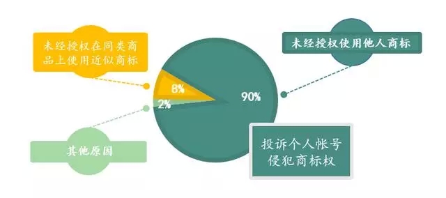 针对个人帐号的商标权侵权投诉,相关数据在类型占比上与公众帐号体现出一致性:90%的投诉系因被投诉人涉嫌未经授权使用他人商标,8%的投诉系因涉嫌在同类或近似商品上使用与投诉人近似的商标,其余2%为其它原因。