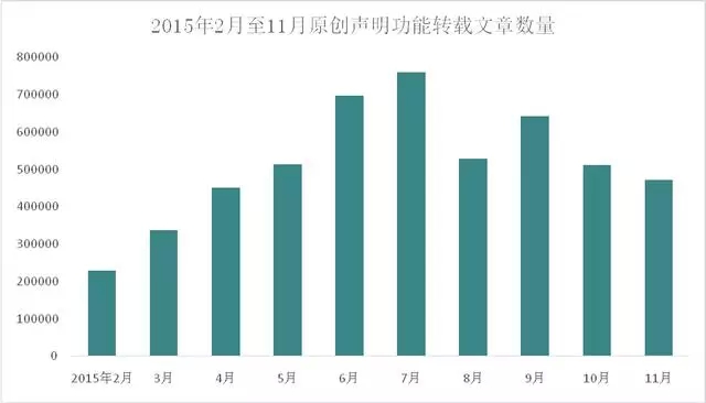 2015年2月至2015年11月十个月间,共有约515万篇文章系利用原创声明功能进行转载传播。这一数字的背后,是微信公众平台对于原创作品及作者的515万次?;?#xff0c;是优质原创文章藉由转载帐号进行的515万次曝光,是转载公众帐号对原创作品的515万次认可,是为读者阅读到更高质量文章增加的515万次可能。