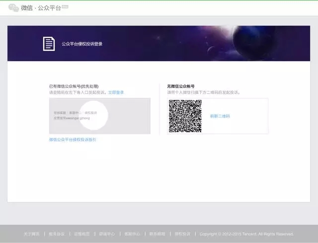 除登录微信安全中心网站进入投诉系统外,还可以登陆微信公众平台官网:https://mp.weixin.qq.com,点击页面下方的"侵权投诉"进入公众帐号侵权投诉系统。