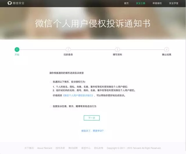 为了方便知识产权权利人及广大微信用户,我们将侵权投诉系统入口进行了整合,放置于微信安全中心(网址:https://weixin110.qq.com/)的"举报维权"栏目下。进入页面后,投诉人按照页面提示点击进入相应的投诉系统即可开始线上投诉流程。