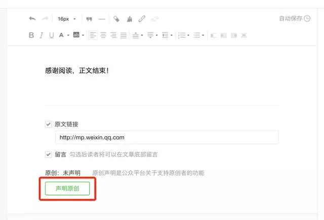 ▲图6-1 公众帐号文章编辑完毕后,点击"声明原创"按钮