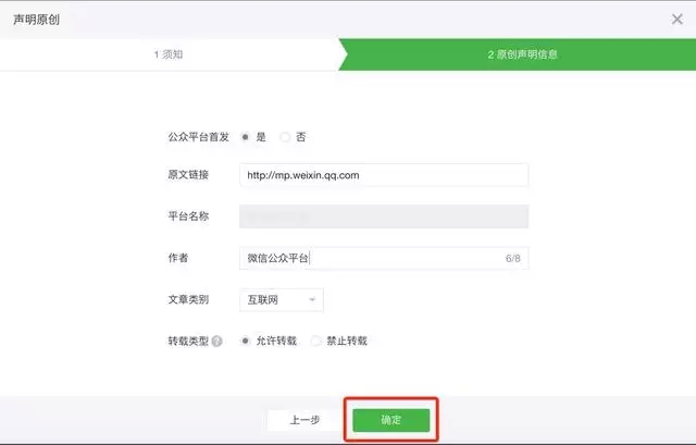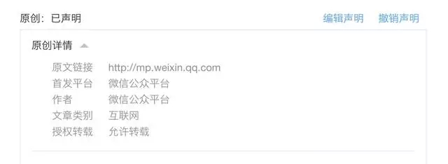 7月底,原创声明功能新增平台转载策略,公众帐号文章运营人对文章成功使用原创声明功能后,可以选择"允许转载"或者"禁止转载";