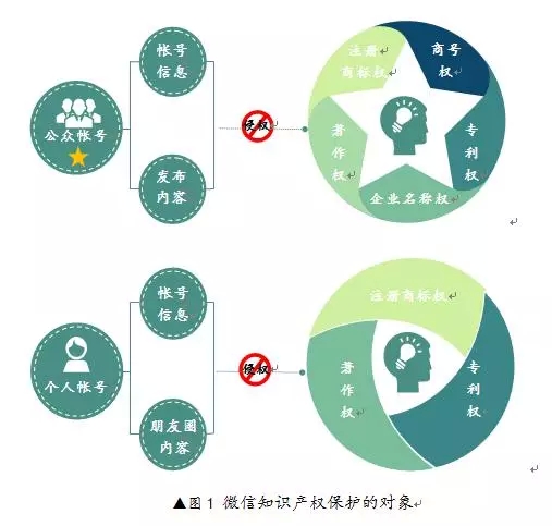 鉴于微信中的用户有两种:公众帐号用户和个人帐号用户,针对这两类群体的行为有不同的策略,二者知识产权?;さ牟嘀氐阋灿兴?#xff0c;具体而言包括:公众帐号名称或帐号信息、公众帐号发布的内容不得侵害他人注册商标权、著作权、专利权,以及因涉及知识产权而应获得保护的企业名称或商号权;个人帐号用户帐号信息、朋友圈中发布内容不得侵害他人的注册商标权、著作权、专利权等。