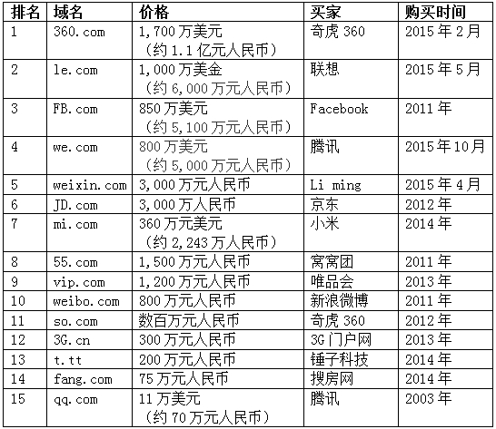 “微信”域名案之所以广受关注,不仅因为腾讯公司及其“微信”商标、产品及服务的知名度,而且因为2015年腾讯公司涉及《商标法》第十条第一款第(八)项“不良影响”条款的“微信”商标行政确权案,更因为该争议域名可能涉及3,000万人民币的“投资”。关于weixin.com域名,早就有媒体报道:2015年4月13日,weixin.com域名当天交易,成交价格达到了8位数,可能在3,000万元人民币左右。此外,根据媒体报道:2015年2月,奇虎360斥资1,700万美元(约合人民币1.1亿元)购买360.com域名;2011年,Facebook斥资850万美元购买FB.com域名。2014年,媒体还盘点出国内10大“天价域名”。笔者根据媒体报道,整理出金额较大的域名交易(图表如下)。(笔者注:媒体报道中关于域名购买这一事实、买家、购买价格的真实性均无法确定,笔者对此信息的真实性不承担任何责任。)
