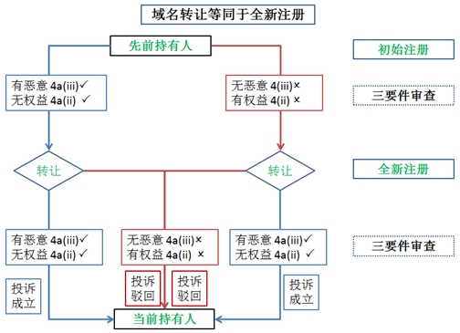 笔者理解:域名、商标的初始注册与后续转让,类似于源与流、源头与支流的关系。源头不清洁,支流一般也受污染。当然,还存在支流处建立大坝进行截流、改道、净化的可能和特例。“域名转让等同于全新注册”实现的功能就是支流处大坝截流、改道、净化,此项类似于调节阀的功能有利于?;ぬ囟ㄇ樾蜗律埔獾?、享有合法权益的域名持有人。
