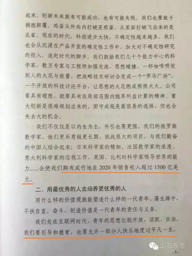 口说迷茫,任正非仍抛出一个雄心勃勃的目标:2020年销售收入要超过1500亿美元。也就是说,未来5年,华为的销售收入要突破1万亿人民币。