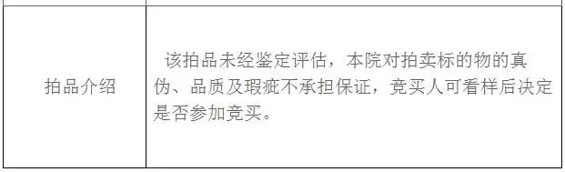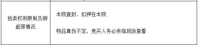 标的物以实物现状为准,法院不承担拍卖标的物真伪、品质与瑕疵保证责任。特别提醒,有意者请亲自实地看样,未看样的竞买人视为对本标的实物现状的确认,责任自负。