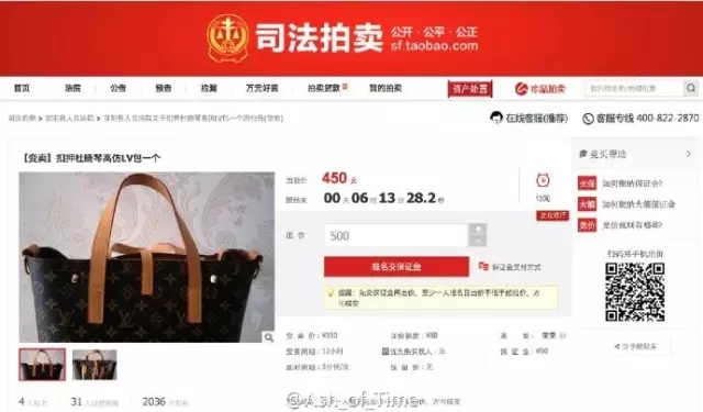 据北京青年报报道,12月20日,河南宜阳县人民法院的一件司法拍卖物品“扣押杜晓琴高仿LV包一个”引起了大家的关注。这件“高仿LV包”的竞拍页面,法院还贴出了两张能清晰看到带有“LV”花纹和图案等包身细节的大图。