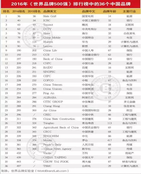 而中国入选的品牌共有36个,其中入围百强的品牌有国家电网、工商银行、腾讯、CCTV、海尔、中国移动、华为、联想。