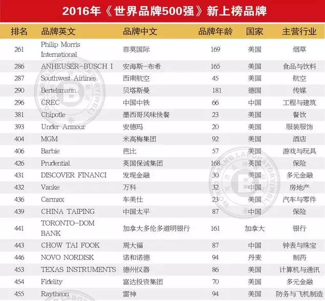 今年新上榜的品牌总计有27个,这些品牌分散于各个行业。其中,有16个品牌来自美国,5个品牌来自中国,其余少数品牌来自于英国、德国、印度等。美国作为世界强国之一,各个行业都有品牌佼佼者,新上榜的墨西哥风味快餐(Chipotle)风靡美国多年,2016年冲破往年食品不洁流言进军榜单,德州仪器(Texas Instrument)、通用电力(General Dynamics)也纷纷进入榜单;而中国新上榜的万科(Vanke)、中国中铁(CREC)、中国太平(CHINA TAIPING)也一直闻名中外。