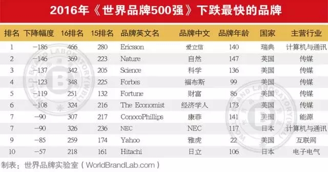 因行业竞争加剧及品牌战略失误,计算机与通讯品牌爱立信(Ericsson)成为今年下滑最大的品牌输家。受到行业不景气的影响,部分品牌的名次下跌也较大。受网路媒体等新兴媒体的影响,传统媒体行业集体下滑,其中自然(Nature)和科学(Science)跌幅最大,知名财经杂志商业周刊(BusinessWeek)直接跌出榜单。美国能源公司康菲(ConocoPhillips)因能源行业的不景气以及石油价格萎靡,其品牌影响力也遭受重创,名次大幅下跌。值得一提的是,新兴行业的迅猛发展与传统老牌行业的衰退有着鲜明的对比,老牌手机制造业也继续下滑,曾经的手机巨头诺基亚也已跌出了500强榜单。