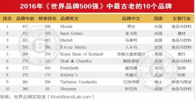 2016年度《世界品牌500强》的平均年龄达到93.71岁,因为剔除了大学等非盈利机构,平均年龄比去年的100.71岁略微下降。其中100岁以上的“老字号”达206个。最古老的品牌是茅台(Moutai),迄今已经有417年历史,圣戈班(Saint Gobain)、马爹利(Martell)因为分别拥有351年和301年历史而分别位居最古老品牌的第二和第三。中国入选的36个品牌中只有茅台(417岁)、青岛啤酒(113岁)和中国银行(104岁)超越百龄。依行业来看,食品与饮料类品牌最古老,100岁以上的入选品牌占到了29个。而互联网品牌最年轻,如连我(LINE)、WhatsApp、Instagram等品牌从建立至今不到10年的时间,却都拥有几亿用户,并成为世界级品牌。