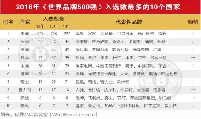 2016年《世界品牌500强》排行榜入选国家共计28个。从品牌数量的国家分布看,美国占据500强中的227席,继续保持品牌大国风范;英国、法国均以41个品牌入选并列第二;日本、中国、德国、瑞士和意大利是品牌大国的第二阵营,分别有37个、36个、26个、19个和17个品牌入选。由此可见,即使欧洲经济低迷,但欧美国家的超级品牌似乎依然坚挺。中国虽然有36个品牌入选,但相对于13亿人口大国和世界第二大经济体, 中国品牌显然还处于“第三世界”。