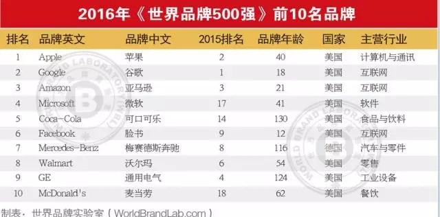 由世界品牌实验室(World Brand Lab)独家编制的2016年度(第十三届)《世界品牌500强》排行榜于12月26日在美国纽约揭晓。苹果(Apple)继2016以来不断推陈出新,总体表现强劲,一举击败谷歌(Google)重返宝座。谷歌(Google)退居第二,亚马逊(Amazon)因为电子商务在全球的普及,以创新的服务继续保持季军的位置。