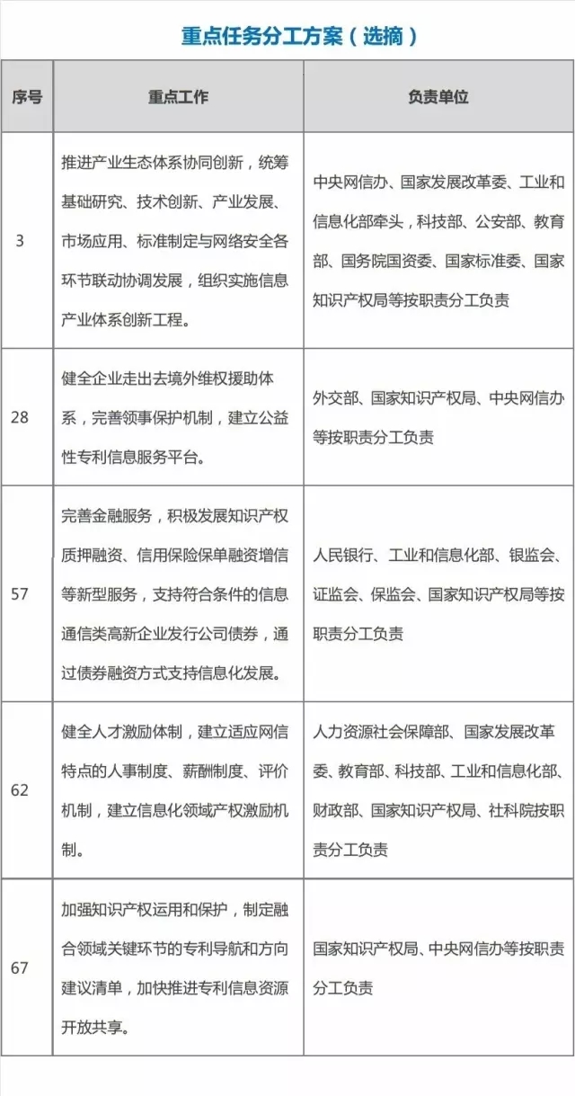 在“拓展网信企业全球化发展服务体系”任务中,规划提出,强化企业知识产权意识,加强对国外行业技术、知识产权等法律法规以及行业标准、评定程序和检验检疫规则的跟踪研判和分析评议,建立公益性专利信息服务平台,为我国企业提供必要的境外专利诉讼和代理、知识产权保护援助服务。在“优化基础环境,推动协同发展”政策中,规划提出,加强知识产权运用和?;?#xff0c;制定融合领域关键环节的专利导航和方向建议清单,鼓励企业开展知识产权战略储备与布局;加快推进专利信息资源开放共享,鼓励大型信息服务企业和制造企业建立交叉交换知识产权池;建立知识产权风险管理体系,健全知识产权行政执法与司法?;び攀苹ゲ?、有机衔接的机制,提高侵权代价和违法成本。