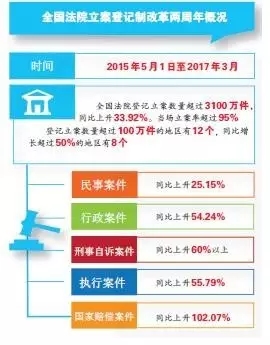 甘雯介绍说,两年来,全国法院全面推进立案登记制改革,“立案难”问题基本解决,切实保障了当事人的诉权。2015年5月1日至2017年3月,全国法院登记立案数量超过3100万件,同比上升33.92%。当场立案率超过95%。登记立案数量超过100万件的地区有12个,其中,江苏、广东、浙江登记立案数量超过200万件。
