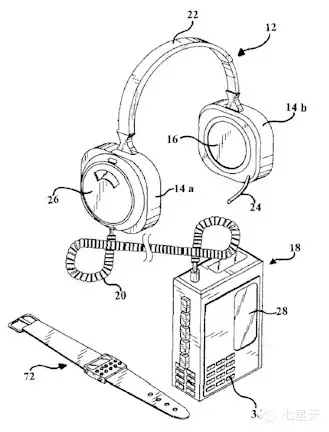依据专利信息显示,‘506专利的申请递交于1999年11月19日,获得授权时间为2003年8月12日。该专利涉及的发明装置包括了:一个集成了数字音乐播放器和电话功能的耳机,耳机上包括固定的闪存??榛蛭⑿凸獾娲⑹胍衾?#xff1b;该耳机以经由可活动的连接线与主控制单元进行电子连接;主控制单元上包括了传呼机、电话、收音机、数码音乐控制器、收音机控制器以及时间显示功能等,这些功能可以通过一只可穿戴的手表进行操控和实现;同时,耳机可以同步实现在播放音乐或收音机时,新传呼、电话接入时的提醒功能。从这一专利的基本信息来看,这一1999年即递交的专利无疑属于今天炙手可热的可穿戴设备专利。?