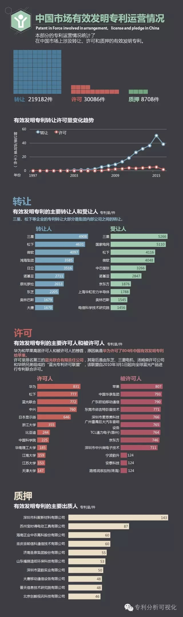 许可方面,华为和苹果高居许可人和被许可人的榜首,原因就是华为许可了804件中国有效发明专利给苹果。许可量排名第三的蓝光联合有限责任公司,其背后是由东芝、三菱电机、汤姆森许可公司和华纳兄弟组成的“蓝光专利许可联盟”,该联盟自2010年3月1日起向全球蓝光产品进行专利的联合许可项目。