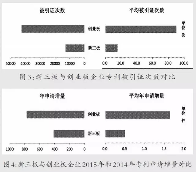 由图3可知,创业板企业专利申请被引证次数4.2万余次,而新三板企业不足1.3万次,创业板企业平均每件专利被引证90次,是新三板企业的近6倍。尽管存在新三板企业相对于创业板企业而言整体更年轻、申请专利时间较晚,导致被引证次数可能偏少这样的客观因素,但不可否认的是,从行业认可度而言,新三板企业的创新能力相对创业板更低。