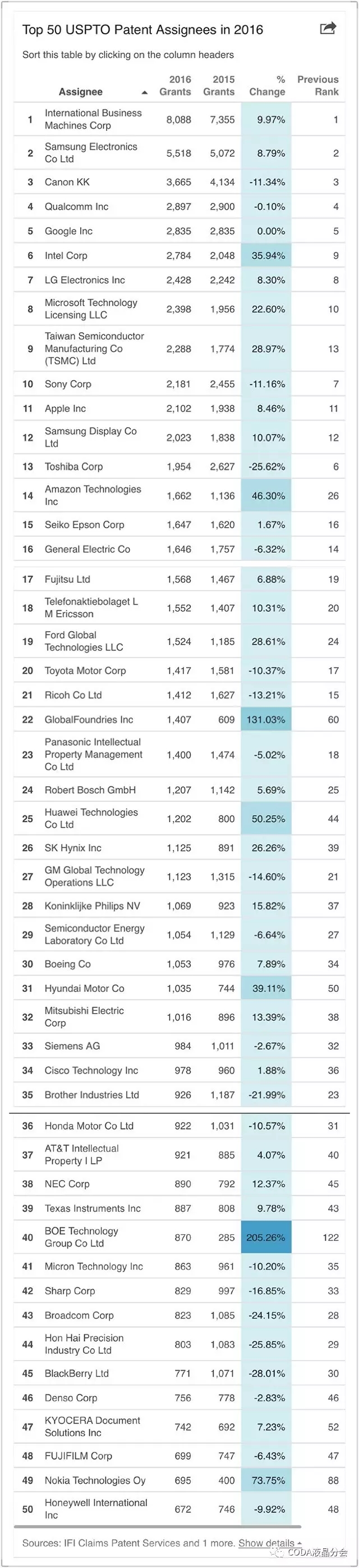 业内专家表示,从专利排名中可以看到公司及行业发展的轨迹。一些大型的日本公司,比如佳能、索尼、东芝和理光的专利数都在不同程上出现了下降。今年的TOP50中迎来了2家中国大陆企业,充分说明了了中国创新实力的崛起,相信今后会有更多的创新公司进入该榜单。