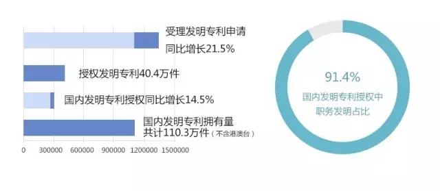 共授权发明专利40.4万件,其中,国内发明专利授权30.2万件,较2015年增长了3.9万件,同比增长14.5%。在国内发明专利授权中,职务发明为27.6万件,占91.4%;非职务发明为2.6万件,占8.6%。?