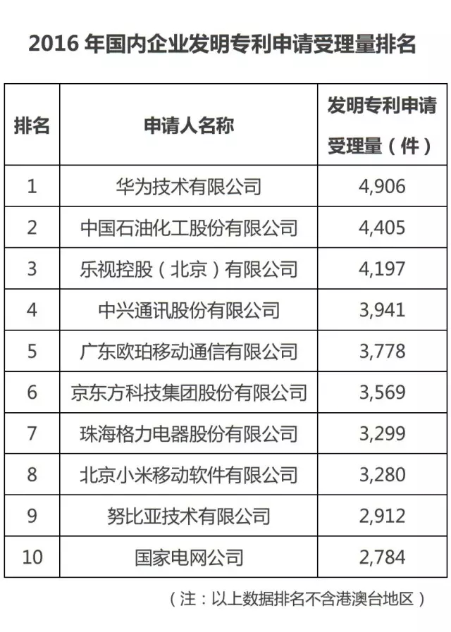 2016年,我国发明专利申请受理量排名前十位的国内(不含港澳台)企业依次为:华为技术有限公司(4,906件)、中国石油化工股份有限公司(4,405件)、乐视控股(北京)有限公司(4,197件)、中兴通讯股份有限公司(3,941件)、广东欧珀移动通信有限公司(3,778件)、京东方科技集团股份有限公司(3,569件)、珠海格力电器股份有限公司(3,299件)、北京小米移动软件有限公司(3,280件)、努比亚技术有限公司(2,912件)、国家电网公司(2,784件)。