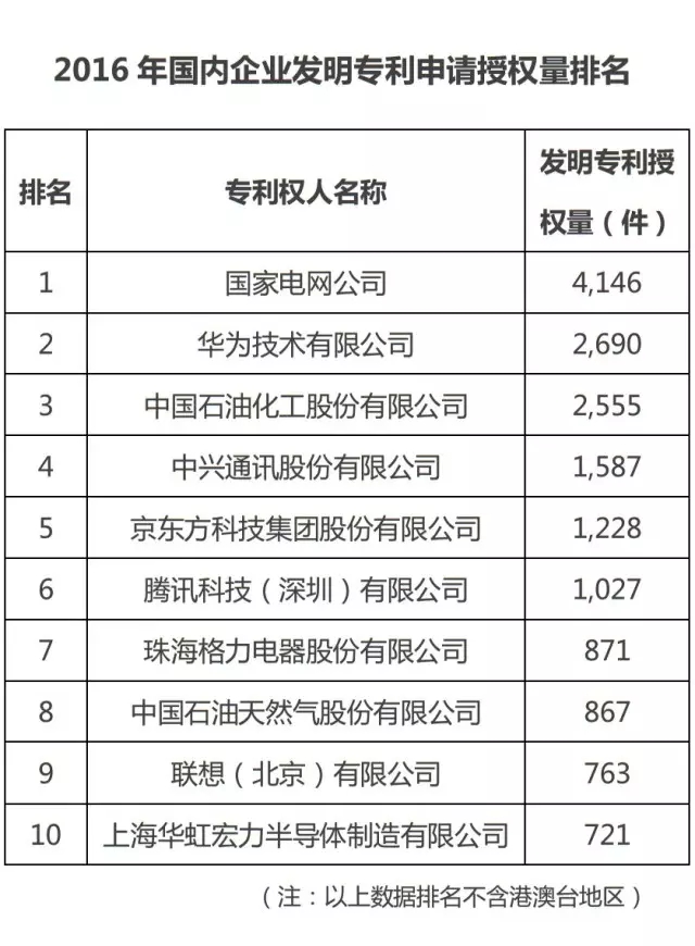 2016年,我国发明专利授权量排名前十位的国内(不含港澳台)企业依次为:国家电网公司(4,146件)、华为技术有限公司(2,690件) 、中国石油化工股份有限公司(2,555件)、中兴通讯股份有限公司(1,587件)、京东方科技集团股份有限公司(1,228件)、腾讯科技(深圳)有限公司(1,027件)、珠海格力电器股份有限公司(871件)、中国石油天然气股份有限公司(867件)、联想(北京)有限公司(763件)、上?;绾炅Π氲继逯圃煊邢薰?#xff08;721件)。