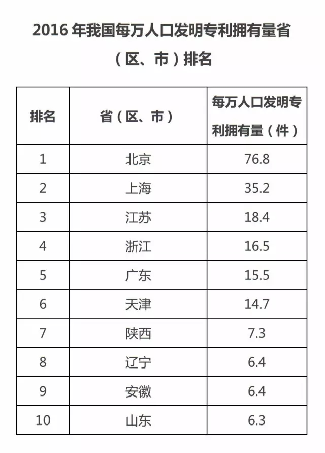 截至2016年底,我国国内(不含港澳台)发明专利拥有量共计110.3万件,每万人口发明专利拥有量达到8.0件。我国每万人口发明专利拥有量排名前十位的省(区、市)依次为:北京(76.8件)、上海(35.2件)、江苏(18.4件)、浙江(16.5件)、广东(15.5件)、天津(14.7件)、陕西(7.3件)、辽宁(6.4件)、安徽(6.4件)、山东(6.3件)。