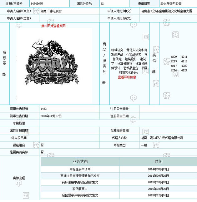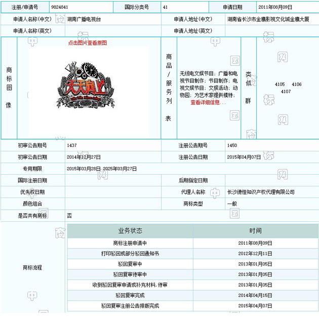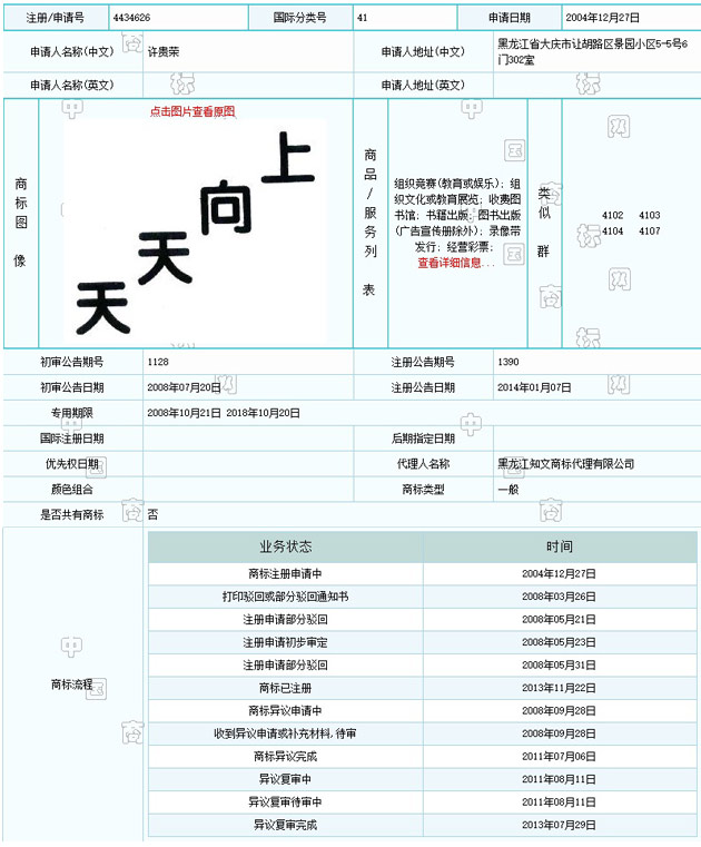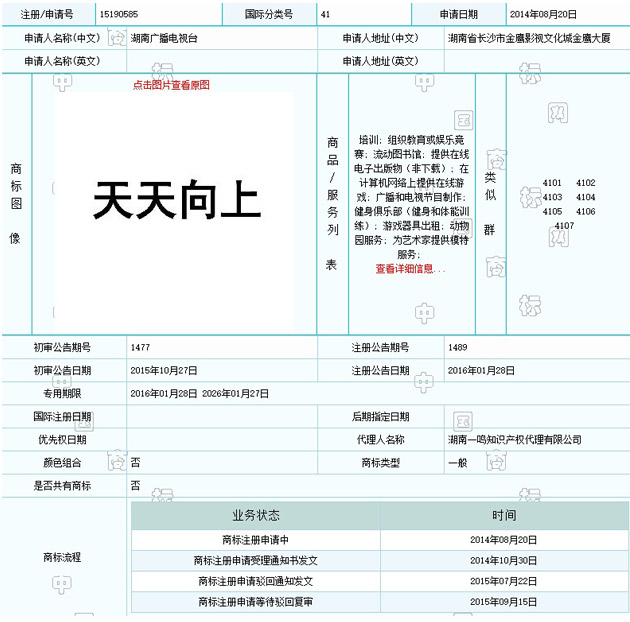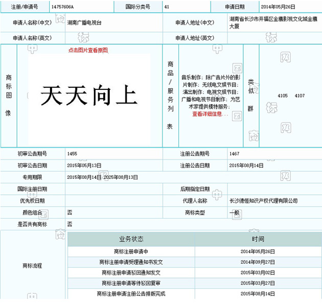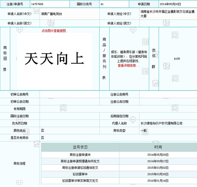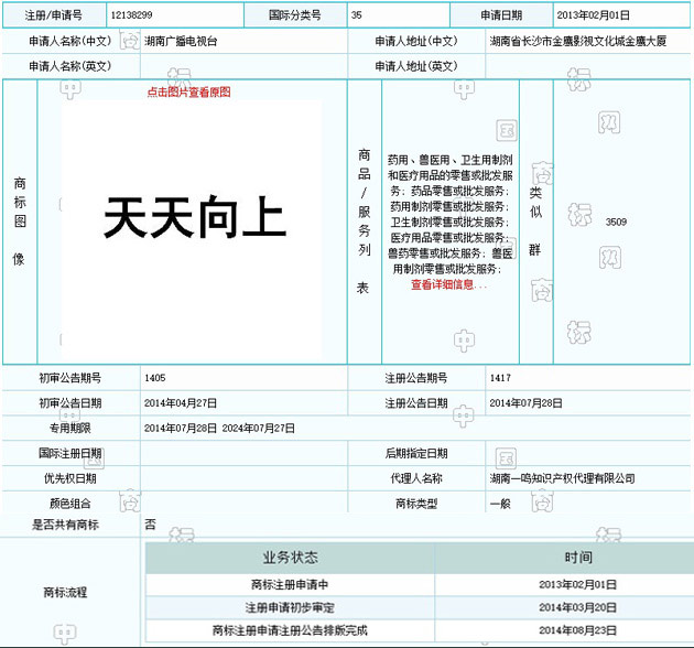 更多 >>经商标局网站查询可知,截至目前,包括已注册商标在内,“天天向上”的有效商标申请共计72件。其中,湖南广播电视台申请的“天天向上”商标情况如下:第35类广告销售等服务上申请的第12138299号“天天向上”商标,申请日期为2013年2月1日,初审公告日期为2014年4月27日,注册公告日期为2014年7月28日。?