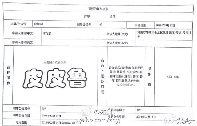 从商标局查询到的第3302660号商标的注册信息来看,此商标已于2004获得注册。有人认为,根据我国法律规定,在先权利人或者利害关系人因侵犯在先权利请求商评委宣告注册商标无效的,应在商标注册后五年内提出无效申请。对恶意注册的,驰名商标所有人不受五年的时间限制。此商标注册已远远超过五年,要无效它很有难度,只能求助于民法通则和侵权责任法了。不过,话说回来,郑渊洁作为皮皮鲁文学作品的权利人,平日里也难以发现其角色名称被郑州某餐馆抢注在餐饮服务上,要不是热心读者询问,郑渊洁还被蒙在鼓里呢,作为权利人,也的确无奈。