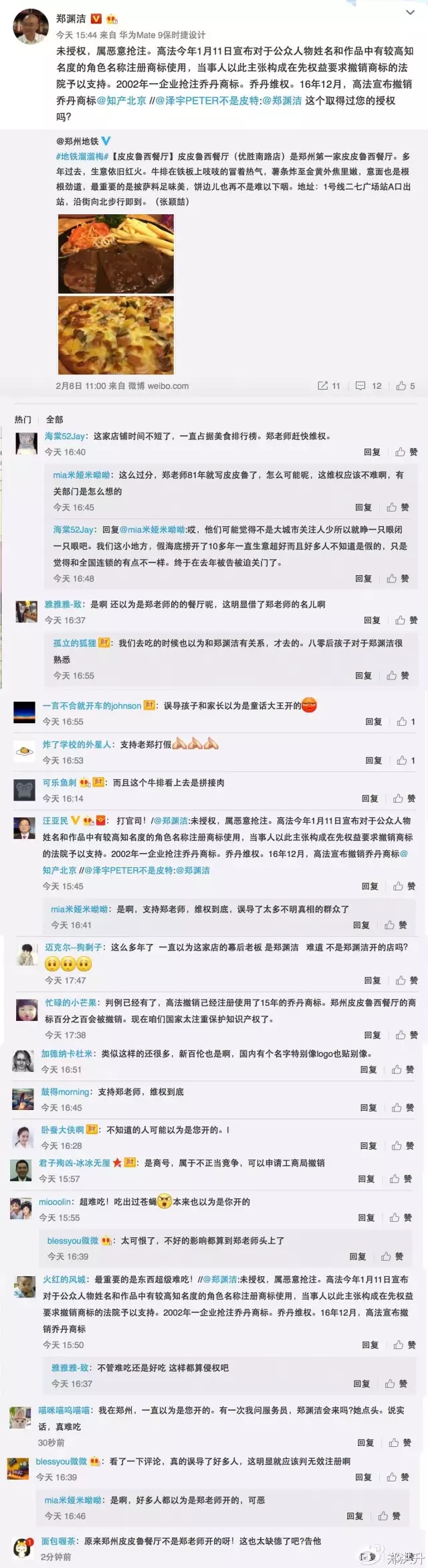 近日,有读者问郑渊洁,皮皮鲁西餐厅和童话人物皮皮鲁是什么关系,使其注意到了这个商标。