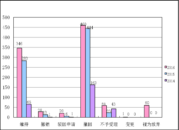 2016年度,商评委共审结行政复议案件974件,包括2015年转入案件169件和2015年新收案件已审结805件,审结率94.8%。审结的案件中,维持被申请具体行政行为的346件,申请人撤回复议申请的460件,撤销被申请具体行政行为的28件,变更被申请具体行政行为的1件,驳回复议申请的20件,不予受理复议申请的59件,视为放弃行政复议申请60件。2014年至2016年复议案件结案方式及数量对比情况见图2: