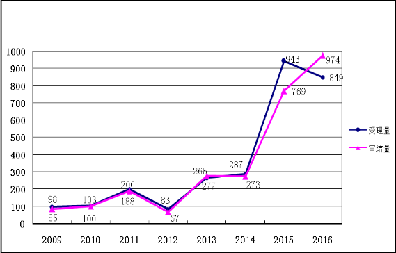 第一,复议案件申请量有所回落,案件审结量创历史新高。在商标注册申请量迅猛增长的形势下,商评委不仅注重事后沟通,积极促成商标局与当事人以和解方式解决争议;而且重视事前调整,对复议中发现的商标注册申请程序瑕疵及时向注册机关提出建议。2016年,商评委共收到商标行政复议申请849件。案件受理量比2015年减少了10.0%。同时,商评委努力克服服审限时间短、案件审理量大等多重困难,积极开拓工作思路,运用多种方式推进复议工作,保障了商标权利人合法权益得到充分救济,为推进商标注册便利化提供了高效服务。截止2016年12月10日,已审结商标行政复议案件974件,比去年同期增长了26.7%,案件审结量达到历史新高。2009年以来的历年复议案件申请量(蓝线上方数据)和审结量(红线下方数据)变化情况见图3: