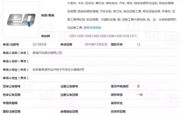 2014年,奇瑞推出旗下纯电动汽车——eQ,并于2016年12月,在第12类汽车等商品上申请注册了“eQ”商标。目前,该商标还未被核准注册。