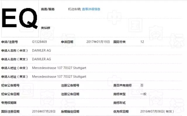 2016年,奔驰正式对外公布旗下全新纯电动汽车子品牌——“EQ”,并于2017年1月至4月,在第12类汽车等商品上,对“EQ”商标提出了领土延伸保护。