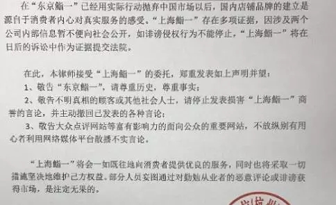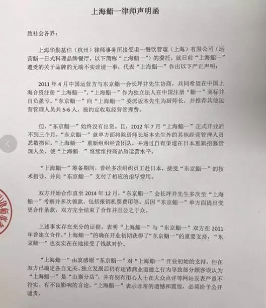 律师声明函中提到,“上?!l一’筹备期间,曾经多次组织员工赴日本,接受‘东京鮨一’的技术指导,并向‘东京鮨一’支付了相应的指导费用?!倍虾!磅l一”是独立的主体,其已经注册商标,商标在中国境内合法使用。郭女士在接受媒体采访时表示,如果“东京鮨一”来中国开店,上海“鮨一”店才是被侵犯权益的一方。