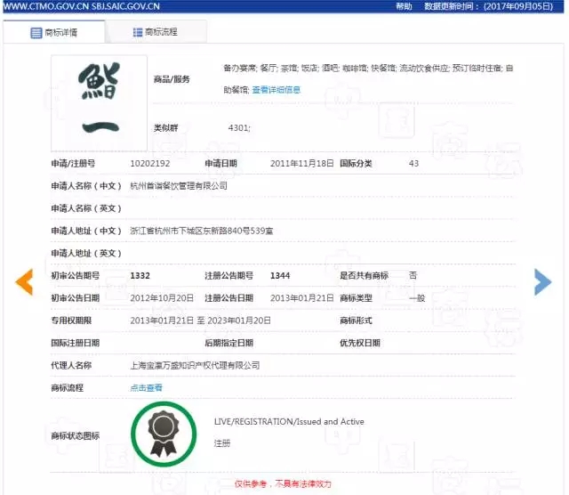 经小编查询,一家名为“杭州首诣餐饮管理有限公司”的主体分别于2011年11月18日、2012年4月19日申请“鮨一”和“鮨一银座”商标,目前均已获得授权,都核准在第43类“备办宴席; 餐厅; 茶馆; 饭店; 酒吧; 咖啡馆; 快餐馆; 流动饮食供应; 预订临时住宿; 自助餐馆”等服务上。