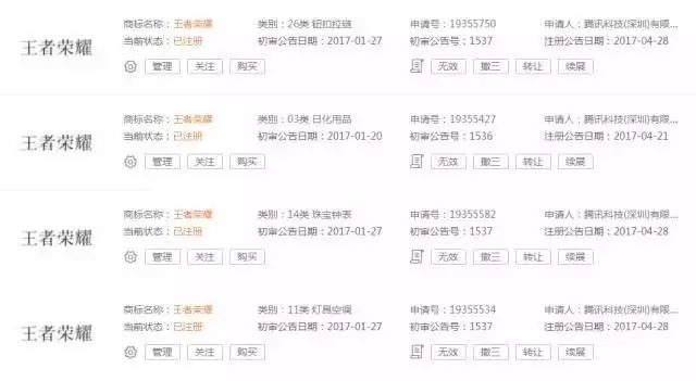 2015年10月到2016年9月,腾讯申请注册商标达56条,从职业赛事推广到多媒体宣发以及周边产品一应俱全,做到45类全面覆盖。