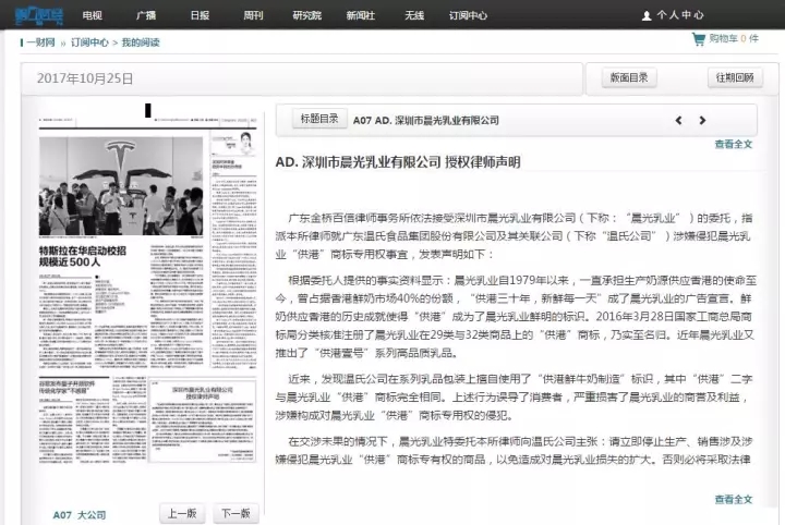 据第一财经日报10月25日报道文章显示:深圳著名乳业品牌晨光委托律师在第一财经日报上发布了律师声明,声称温氏乳业在其生产的部分乳品包装上擅自使用了“供港鲜牛奶制造”标识,其中“供港”二字与晨光乳业“供港”商标完全相同,要求温氏立即停止侵权行为。