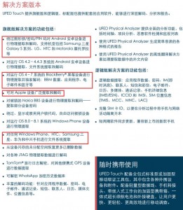 不仅如此,从Cellebrite官网上也能看出,他们对苹果还是有些避讳的。Cellebrite声称其能对三星Galaxy系列、HTC、摩托罗拉等安卓手机进行解锁,还能对诺基亚的塞班、微软Windows Phone、黑莓、华为、中兴等公司的手机进行解锁并提取数据,而对于苹果设备,介绍文件中却一笔带过——“可对Apple设备广泛提取和解码”。
