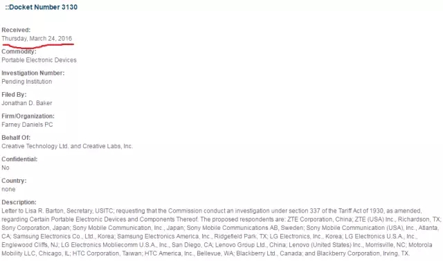 而同一天(3月24日),Creative Technology也在ITC发起了申诉(Complaints),申诉编号为3130,申诉的对象仍然是上述这些智能手机厂商。而上周,美国ITC接受了Creative Technology的申诉请求,正式启动337调查程序。